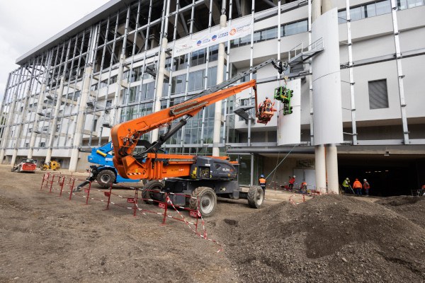 Dans une logique d’économie circulaire, les pièces sont prélevées sur des avions long-courriers réformés et démantelés. Elles mesurent 6 mètres de long, pour des masses variant de 400 à 700 kilos selon leur emplacement initial dans la structure de l’avion. La grue les soulève délicatement à l’aide de ventouses pour les positionner minutieusement sur la façade, où elles sont ensuite solidement fixées sur un squelette métallique. « Au total, il y a 196 pièces à poser pour couvrir 3000 m2 », calcule Rolando Pereira, responsable de site de la société Blocotelha, qui s’est déjà chargée de la charpente et de la toiture de la nouvelle tribune de 11.500 places, abritant notamment des loges et des salons.