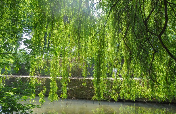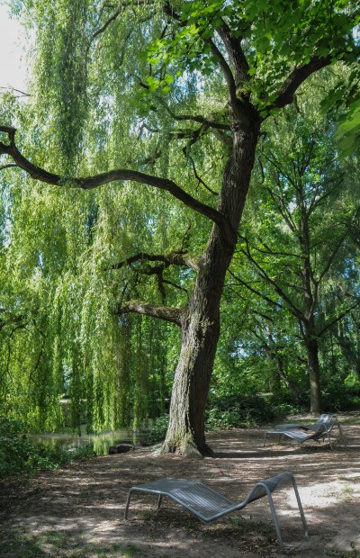 Grâce aux nombreux arbres qui bordent les berges du Ziegelwasser, comme ce saule pleureur, la promenade reste ombragée. Des panneaux d’information ont aussi été installés au pied d’arbres remarquables : un hêtre panaché blanc, un érable du Cappadoce ou un frêne rouge d’Amérique. Photo Ayrine Barlier -