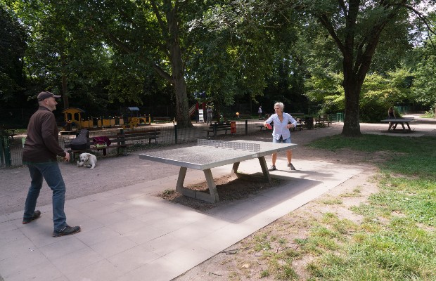 Dans le parc du Kurgarten, agrès sportifs, espace pour les chiens et table de ping-pong attirent le public. Christophe y retrouve Eliane pour une partie et en profite pour sortir son chien, baptisé Sam. "Des fois, je viens aussi jouer de la guitare", ajoute Christophe. Photo Jérôme Dorkel -