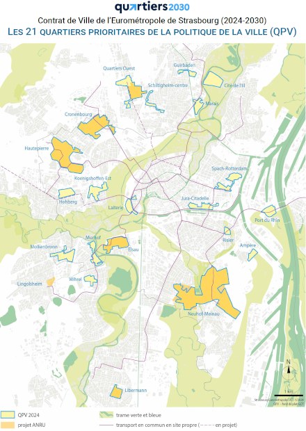 Le périmètre des zones concernées a connu quelques évolutions par rapport au précédent Contrat de ville (2015-2023). Quatre nouveaux QPV sont créés : Centre à Schiltigheim, Wihrel à Ostwald, Jura-Citadelle (Esplanade) et Risler (Neudorf) à Strasbourg. Cinq autres voient leur périmètre modifié : Molkenbronn à Strasbourg-Lingolsheim, ainsi que Murhof, Koenigshoffen-est, Spach-Rotterdam et Neuhof-Meinau à Strasbourg. Enfin, le quartier des Hirondelles à Lingolsheim n’est plus classé comme un QPV.