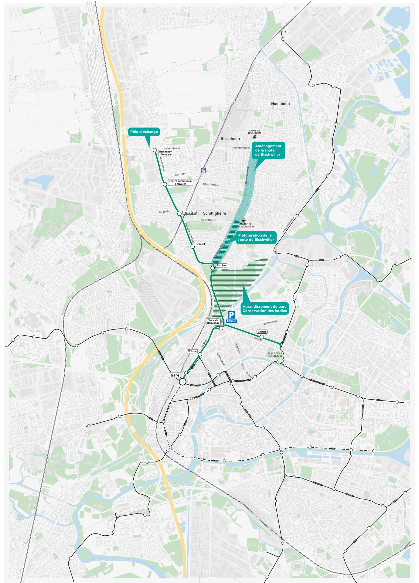 • La nouvelle ligne H, qui remplacera l'actuel bus H, partira de la gare pour assurer une desserte rapide et performante des Institutions européennes et les quartiers du Wacken et de Robertsau en passant par l'avenue des Vosges requalifiée.