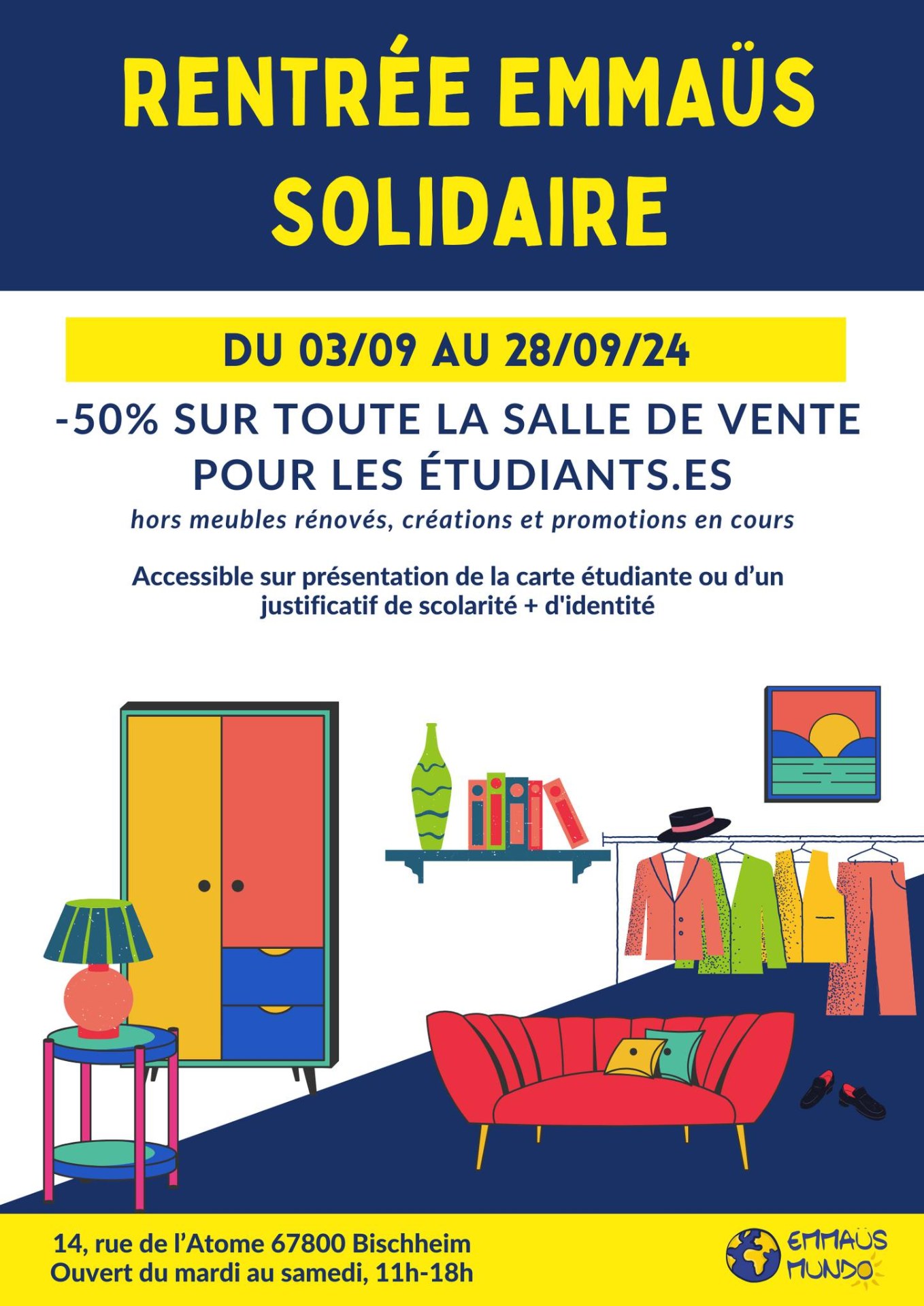 Emmaüs Mundo (site de vente situé à Bischheim, 14 rue de l'Atome) propose aux étudiants strasbourgeois une réduction de 50% sur l'ensemble du magasin pendant tout le mois de septembre.