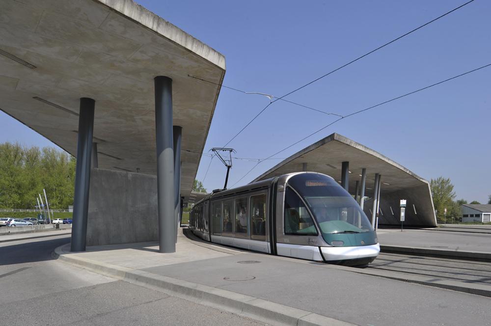 La station de tramway est couverte d’un auvent en béton brut, plié comme une feuille de papier et soutenu par quarante-quatre poteaux : disposés irrégulièrement, et d’inclinaisons obliques différentes, ils procurent une forte impression de dynamisme. Le traitement de la lumière vient renforcer ce traitement plastique de l’espace : d’étroites ouvertures percées dans la dalle de béton projettent sur le sol des jeux d’ombres et de lumière. De nuit, le terminal donne le sentiment d’être construit sur de véritables colonnes lumineuses.