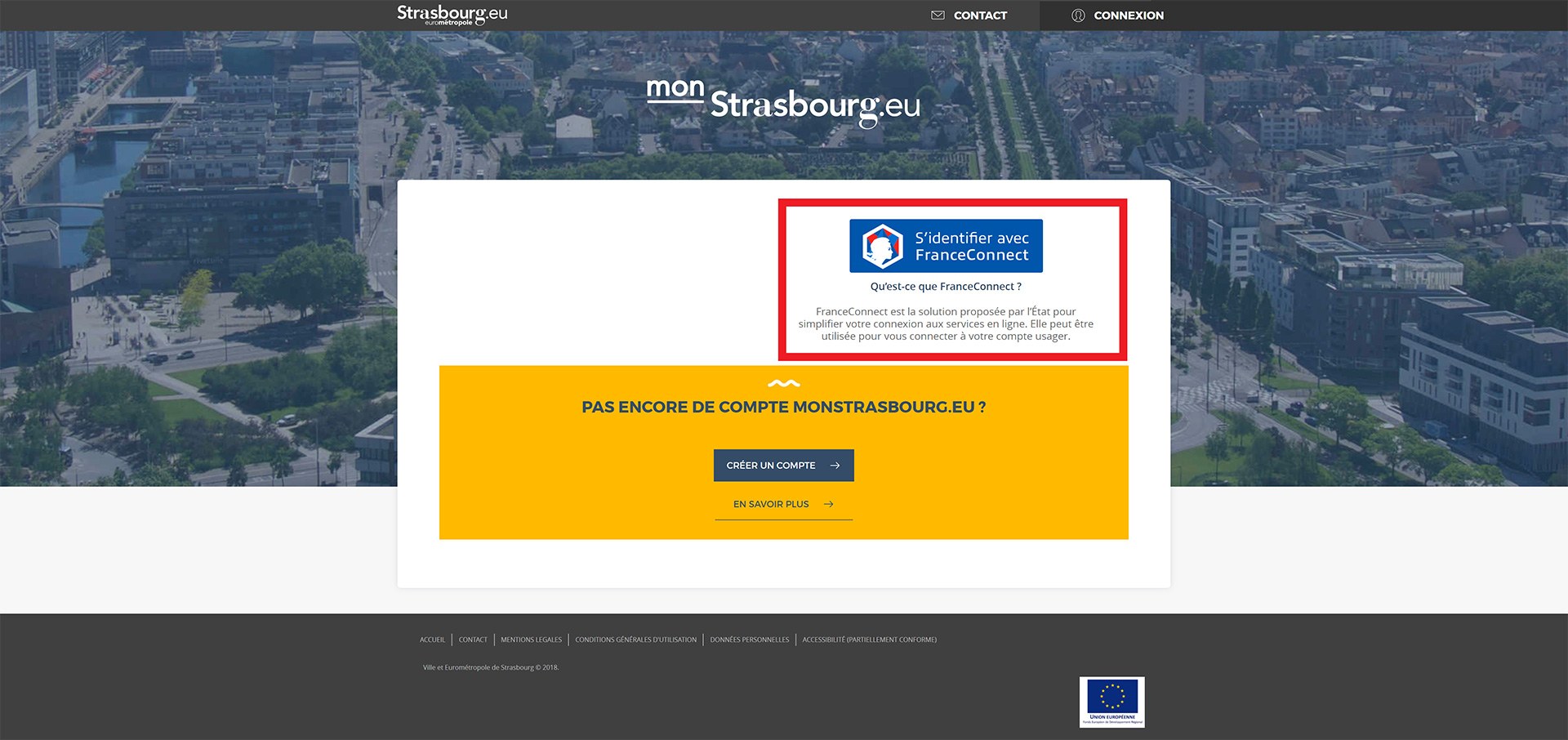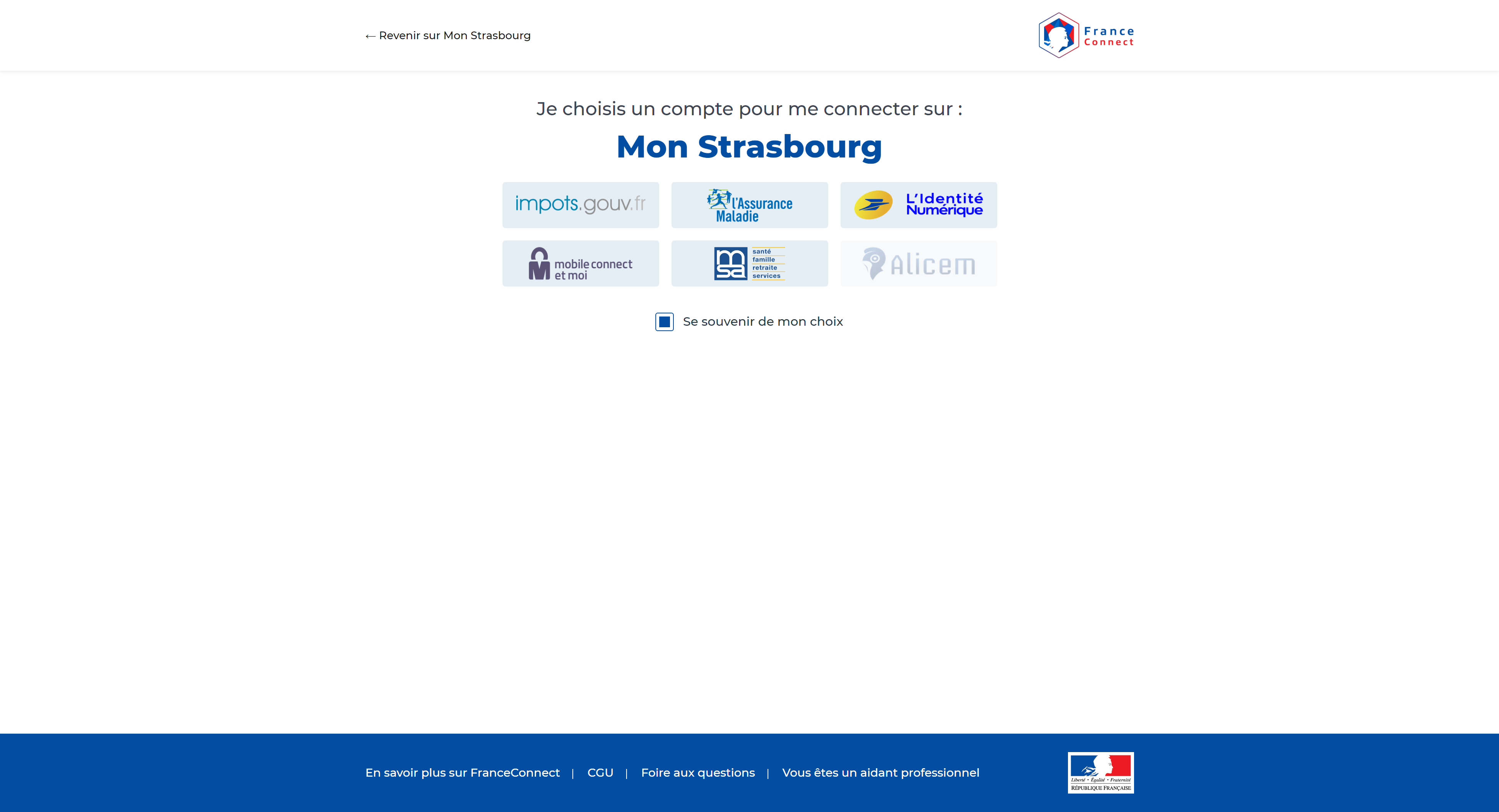 FranceConnect est un service sécurisé de l’Etat qui vous permet d’associer votre compte MonStrasbourg à votre compte impots.gouv.fr, Assurance Maladie, la Poste, etc. MonStrasbourg ne récupèrera que les données nécessaires depuis le service que vous choisirez.